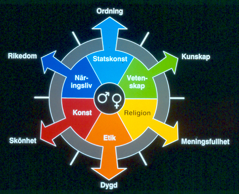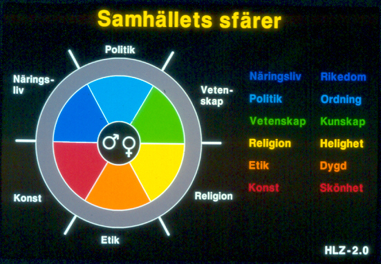 Komplicerade processer — som vi inte här skall diskutera — bygger av de sex mönsterbildande variablerna sex fundamentala sfärer i samhället, nämligen system för näringsliv, politik, vetenskap, religion, moral och konst. För att antyda sambanden har de i vår figur fått färger som säger att näringsliv och ekonomi hänger ihop med exekutiva värderingsutsagor (t ex priser och kostnader), att politik och administration hör samman med exekutiva föreskrifter (t ex lagar och bestämmelser) att vetenskap hör samman med exekutiva beskrivningar (t ex fakta och generaliseringar).